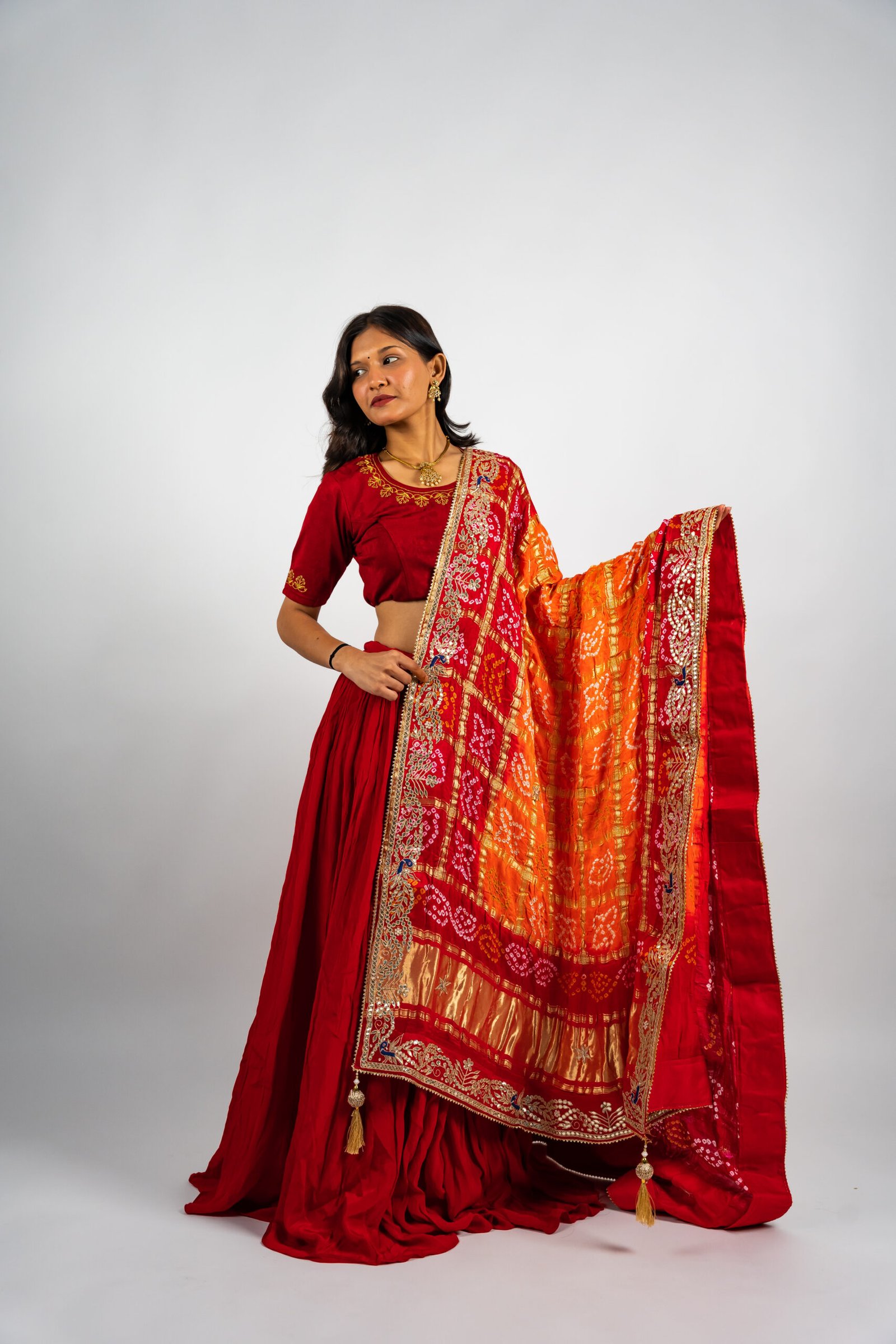 Gota Patti Work – Handcrafted Anmol Colour gota patti embroidery enhances the dupatta with rich Rajasthani artistry, adding a regal and festive charm.