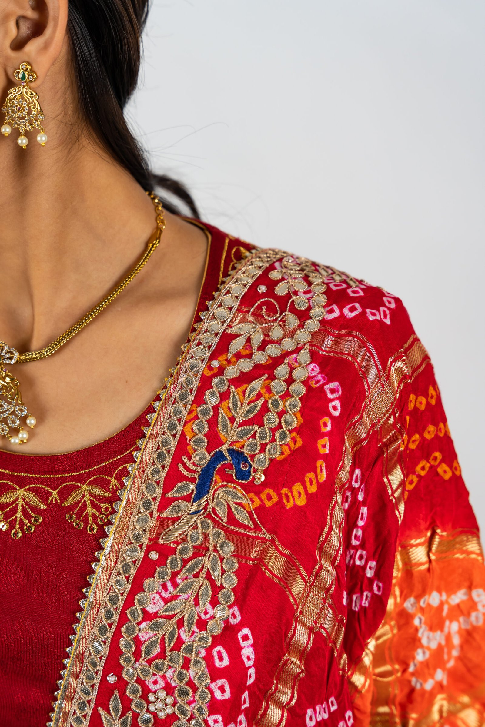 Ghatchola Weave – Traditional Bandhani tie-dye technique from Rajasthan, crafted in a ghat pattern that symbolizes festivity and heritage.