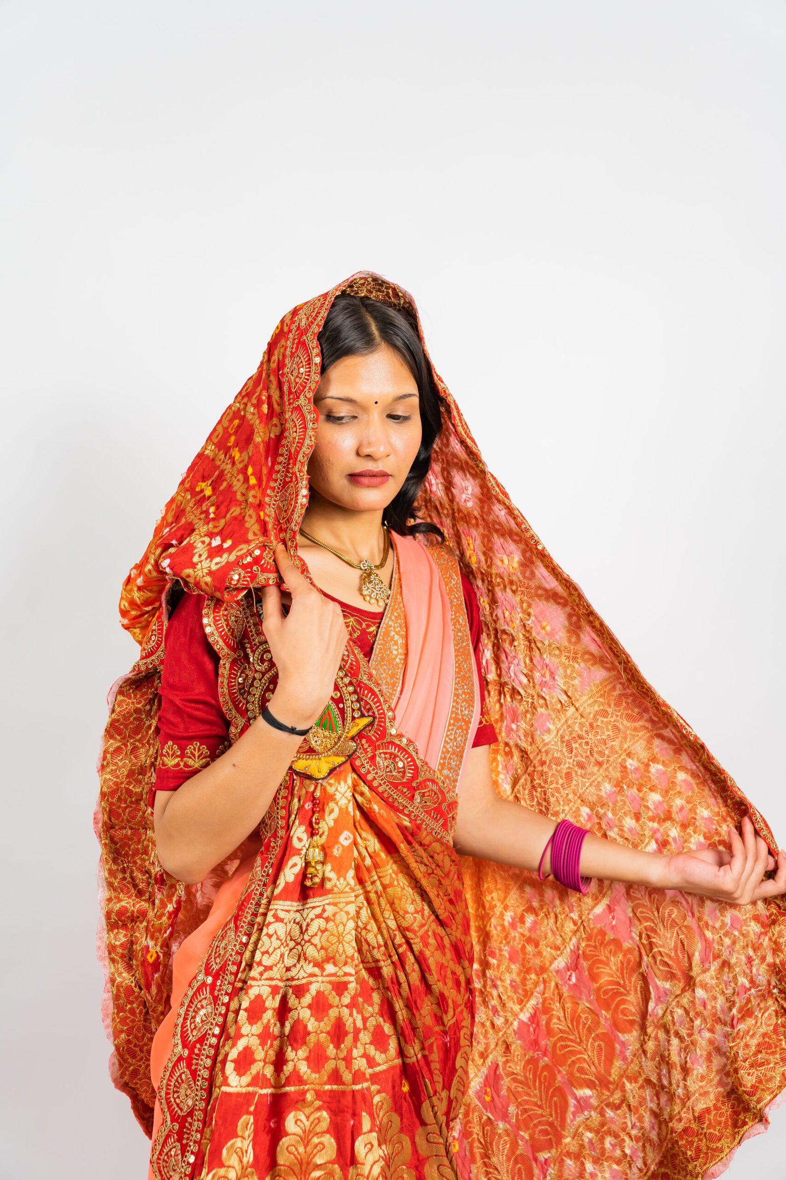 Elegant Odhna featuring Kalash Buta Brooch design on one side in Peela, Chunri AND Pomcha Available.”