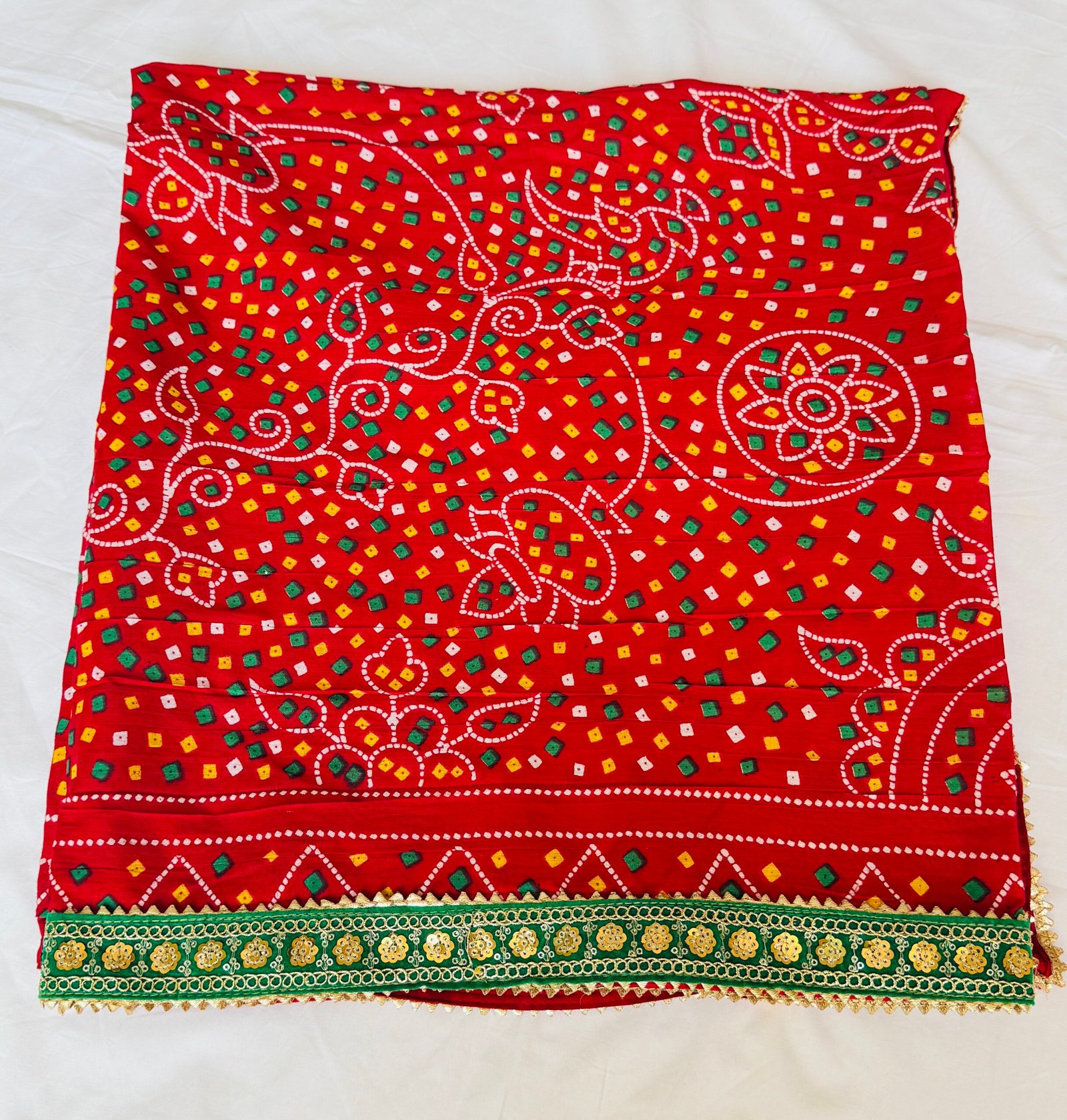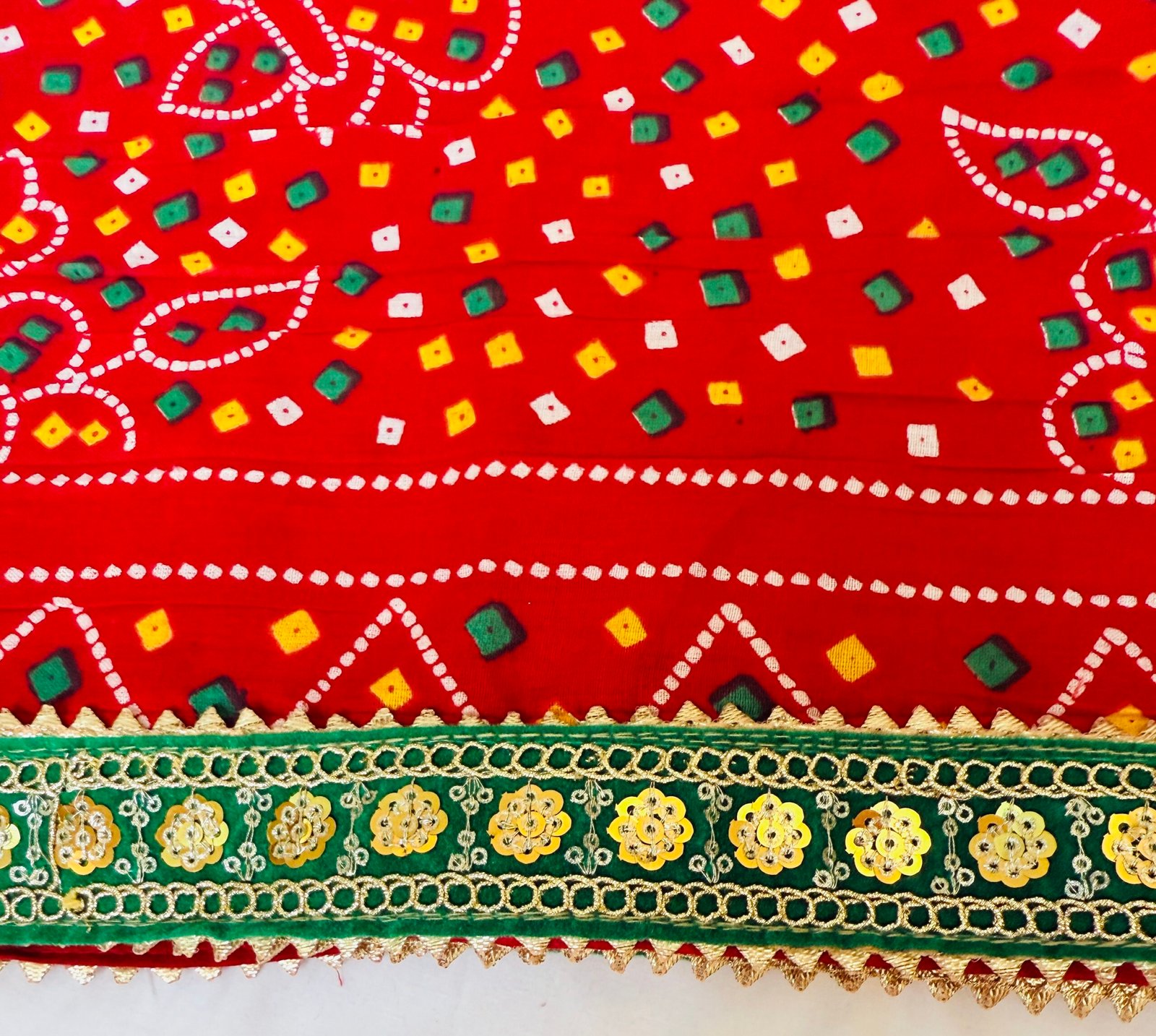 Adorned with beautiful bandhej patterns and gota work, it’s perfect for wedding rituals.