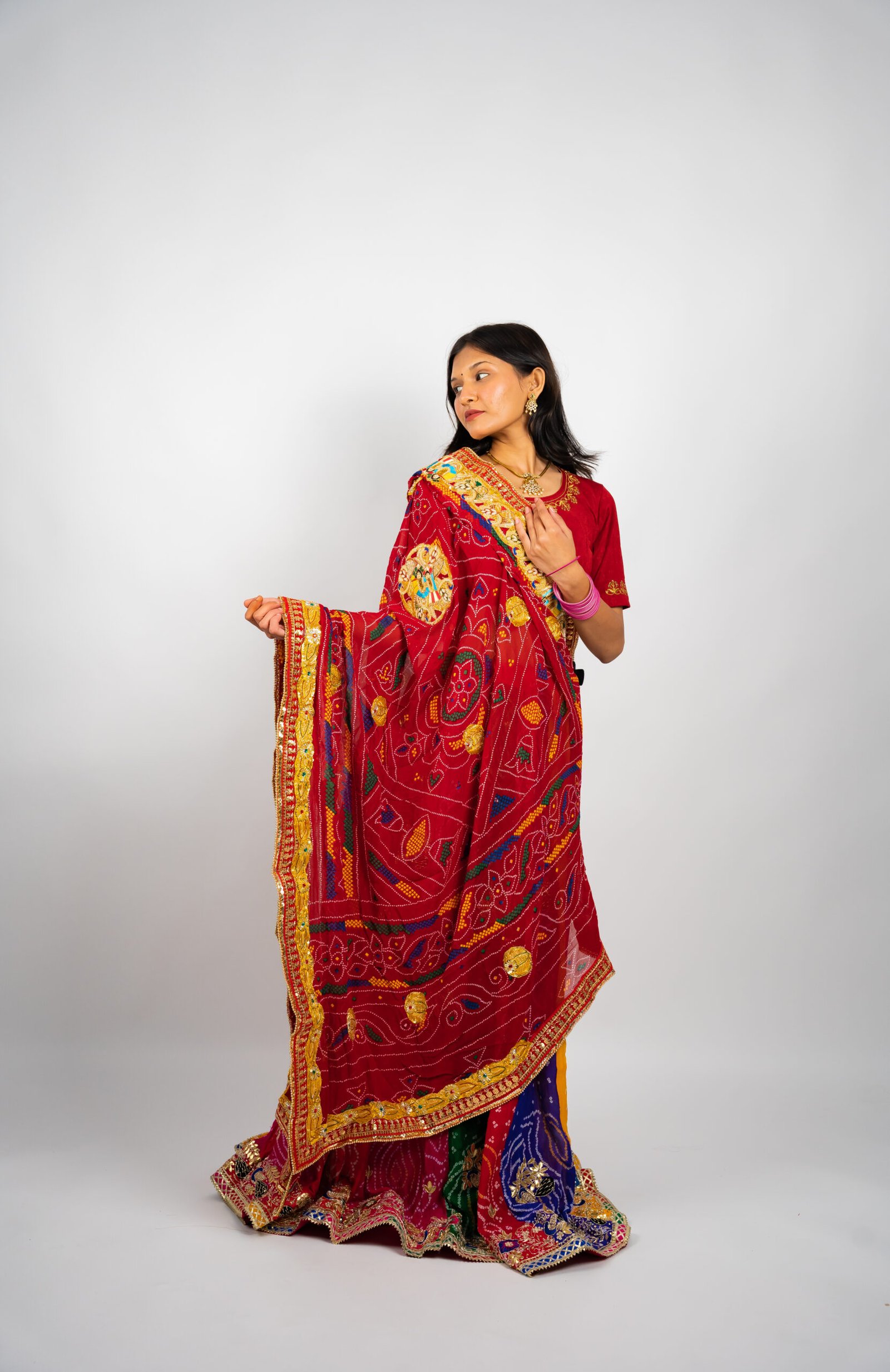 2.Embellished with gota patti, zari, or zardozi borders, giving it a festive