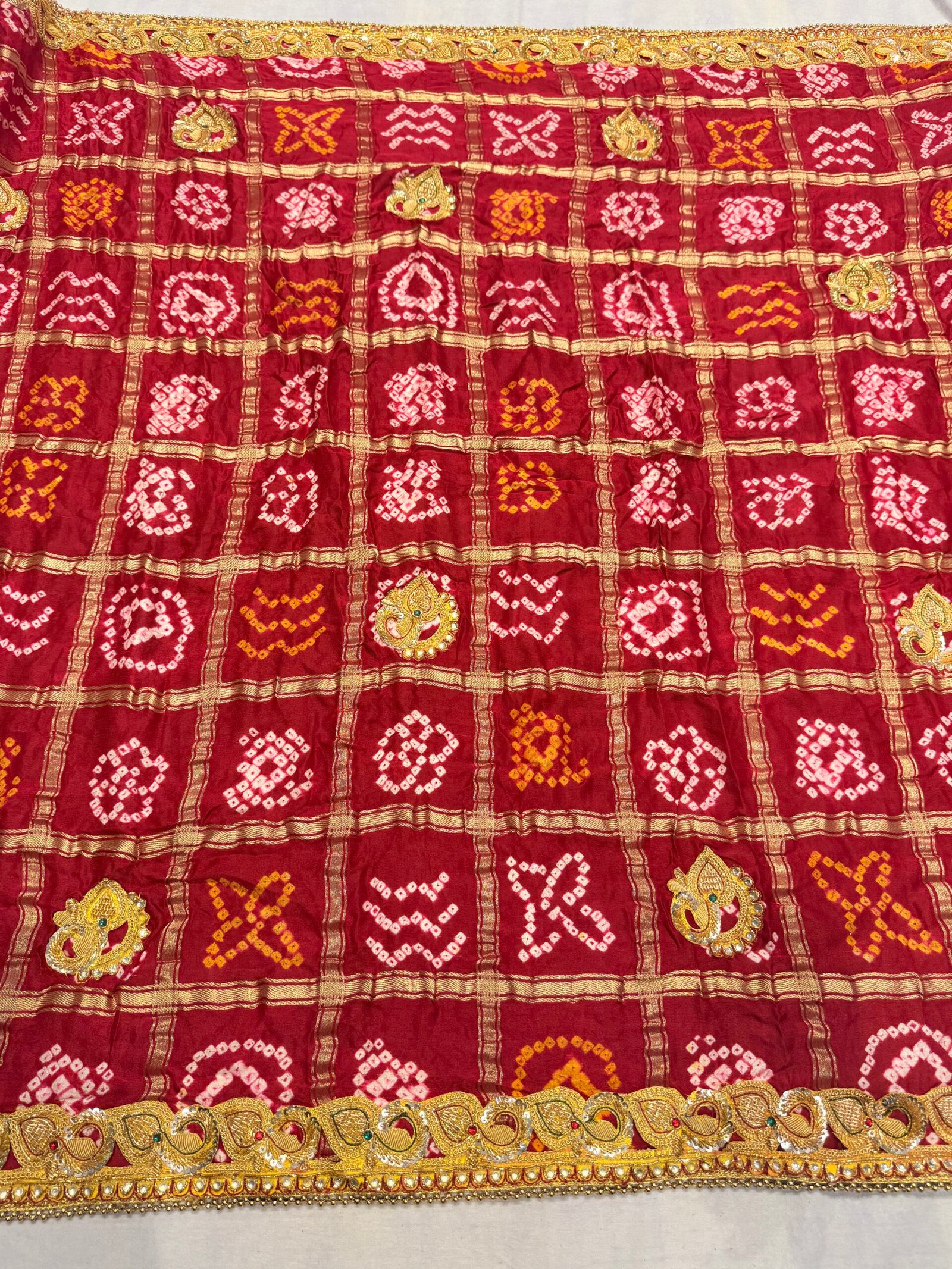 Ghatchola Weave – Traditional Bandhani tie-dye technique from Rajasthan, crafted in a ghat pattern that symbolizes festivity and heritage.