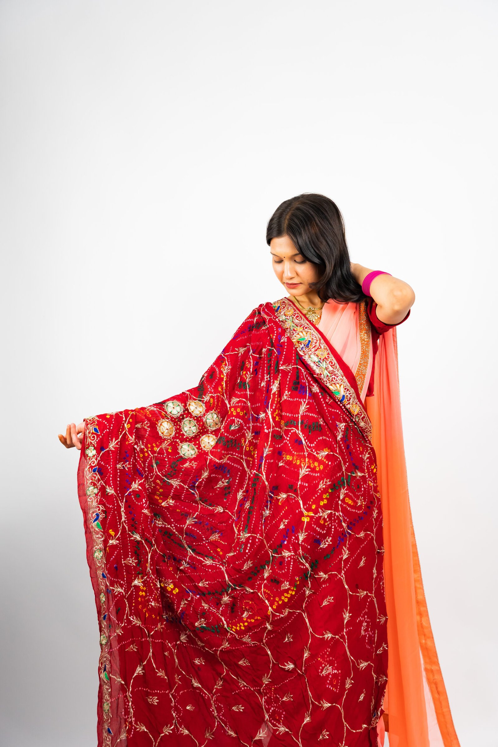 Traditional Use in Marriage –1. “The Bhat Ki chunri” plays an auspicious role during wedding rituals.2.It is used in sindoor daan and ghunghat ceremonies, representing purity, blessings, and marital harmony.3.Elders often place the chunri on the bride Mother”s head as a mark of blessings and new beginnings.