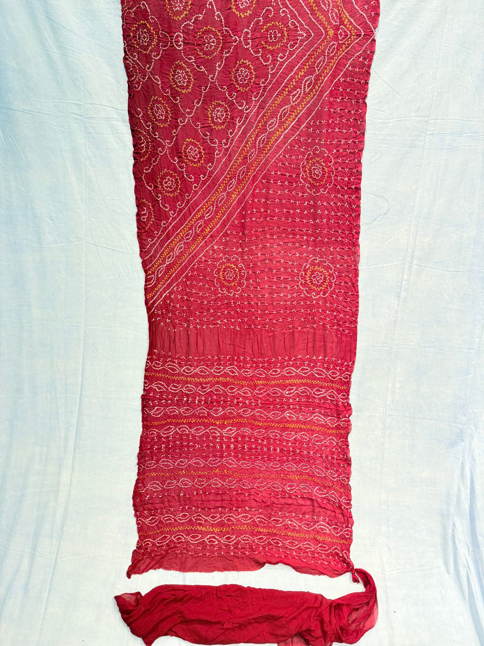 Each bandhej dot is tied and dyed by hand, reflecting skilled craftsmanship.