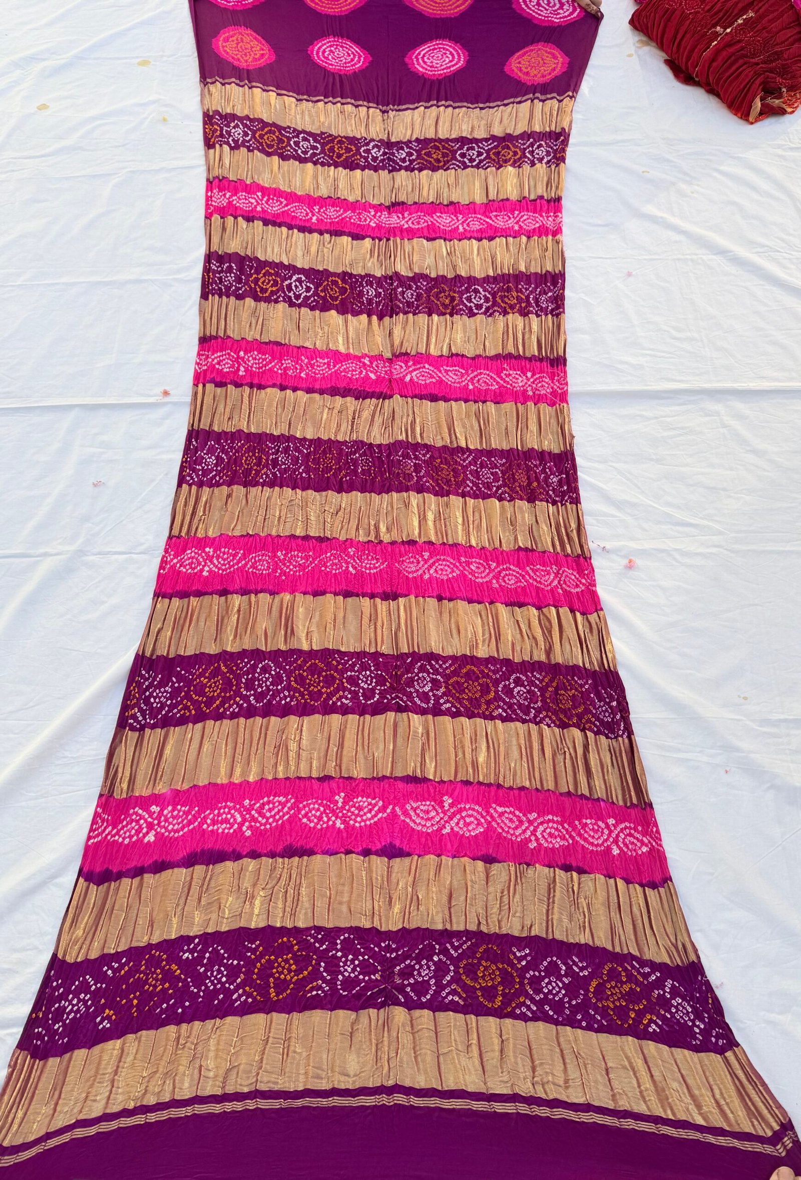 Gajji silk with Bandhej is popularly used for dupattas, odhnas, and sarees.