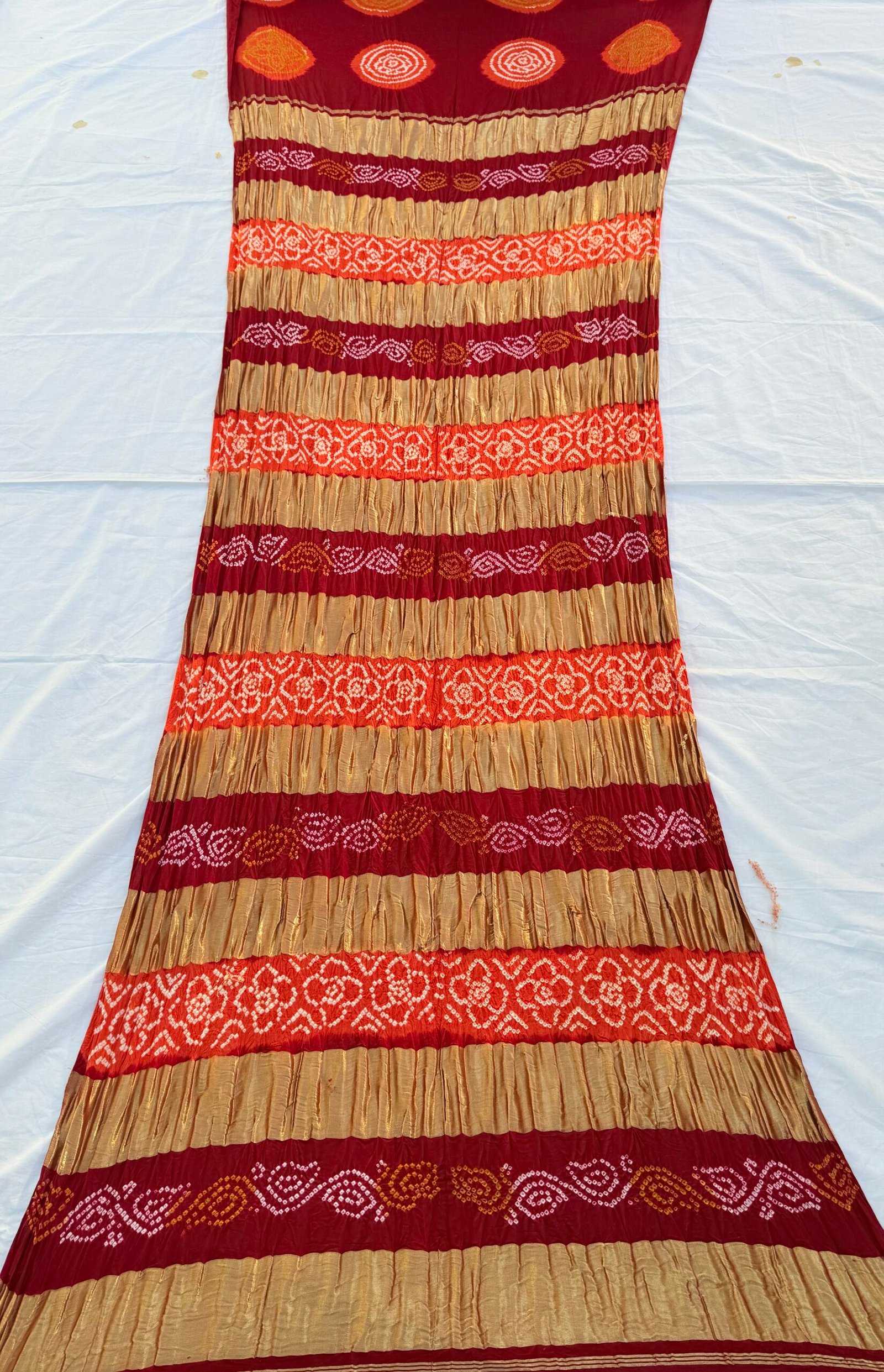 Each bandhej dot is tied and dyed by hand, reflecting skilled craftsmanship.