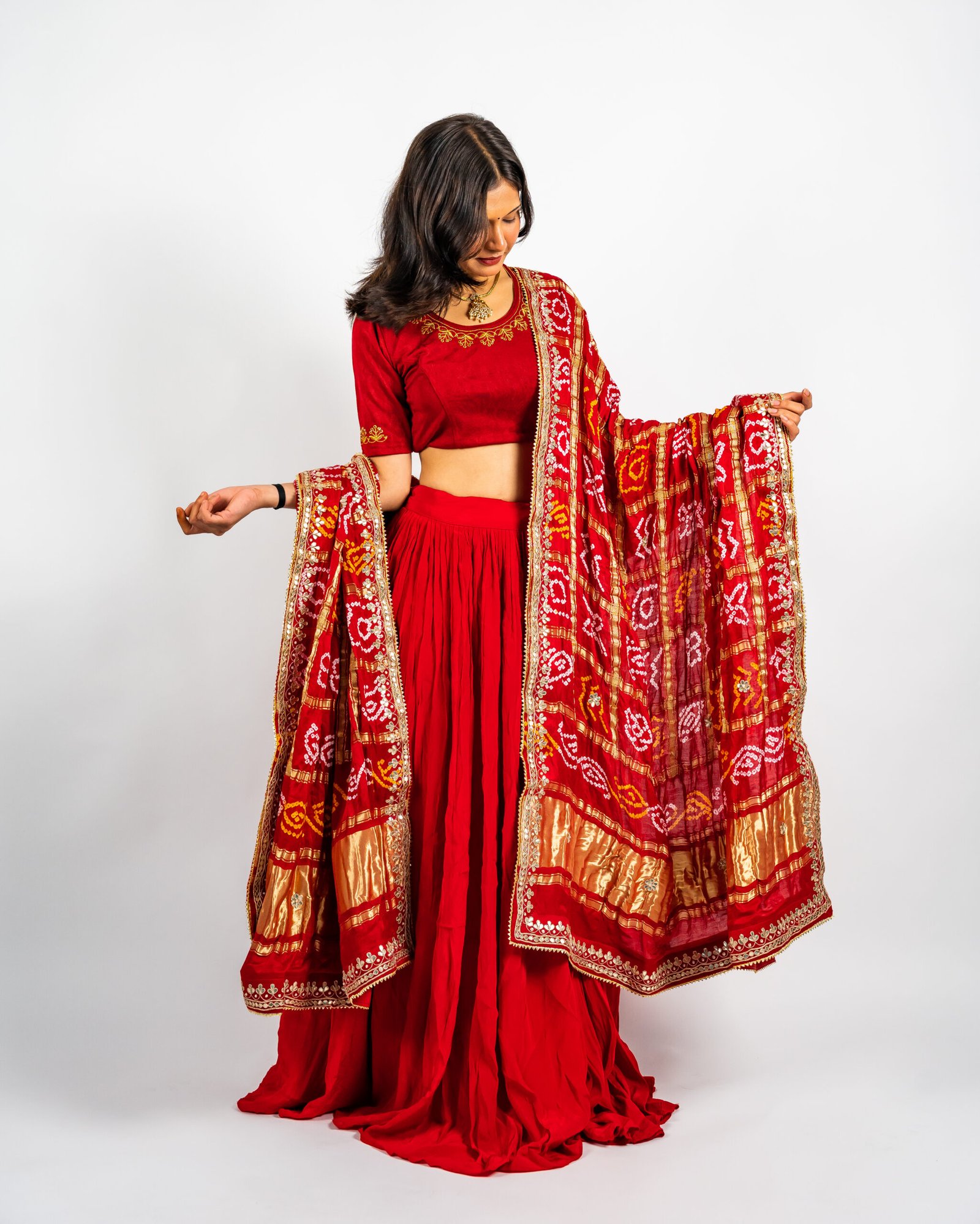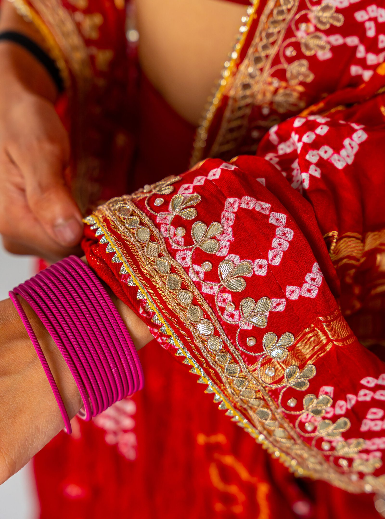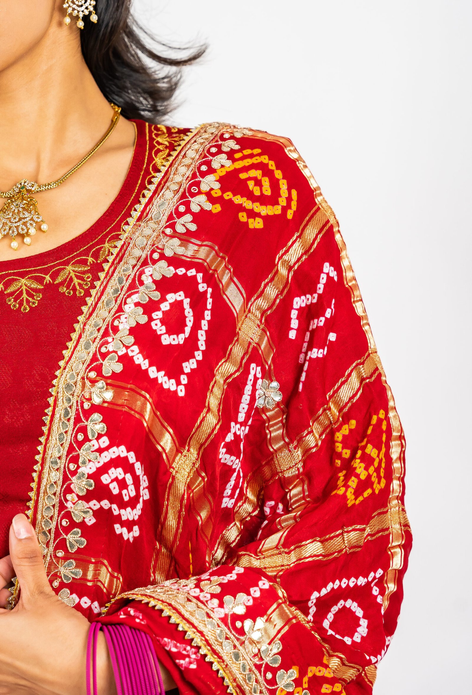 Ghatchola Weave – Traditional Bandhani tie-dye technique from Rajasthan, crafted in a ghat pattern that symbolizes festivity and heritage.