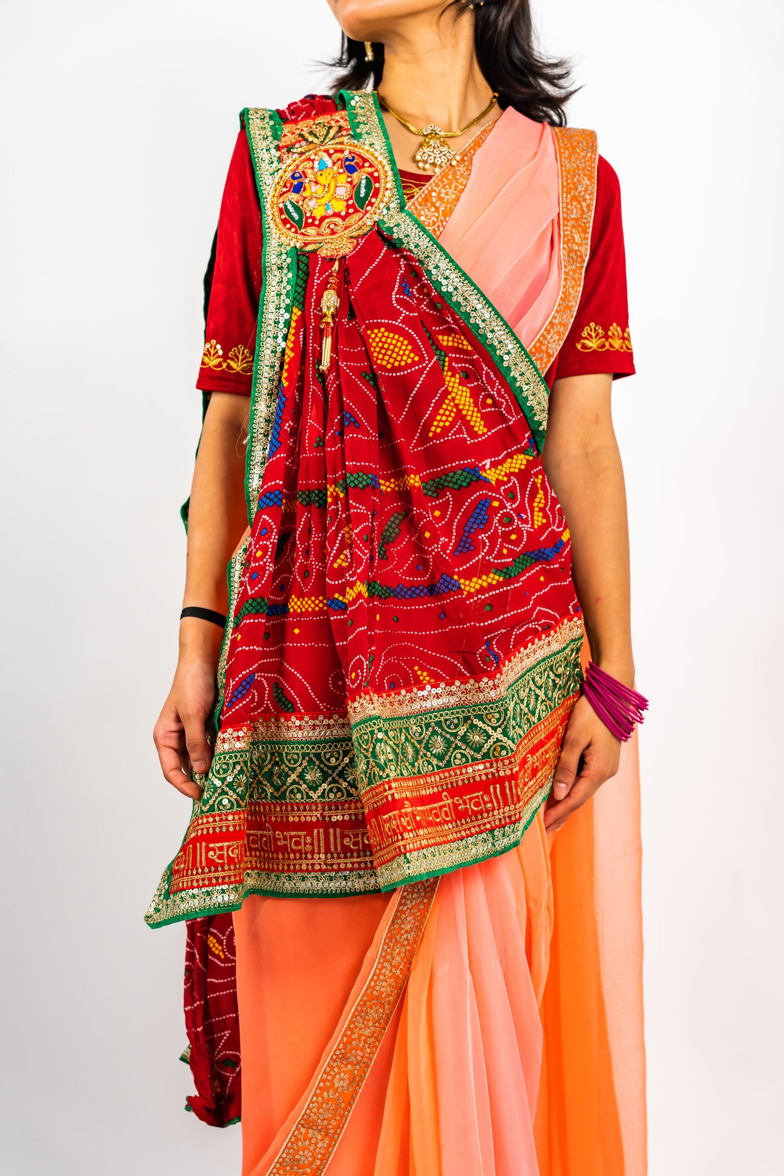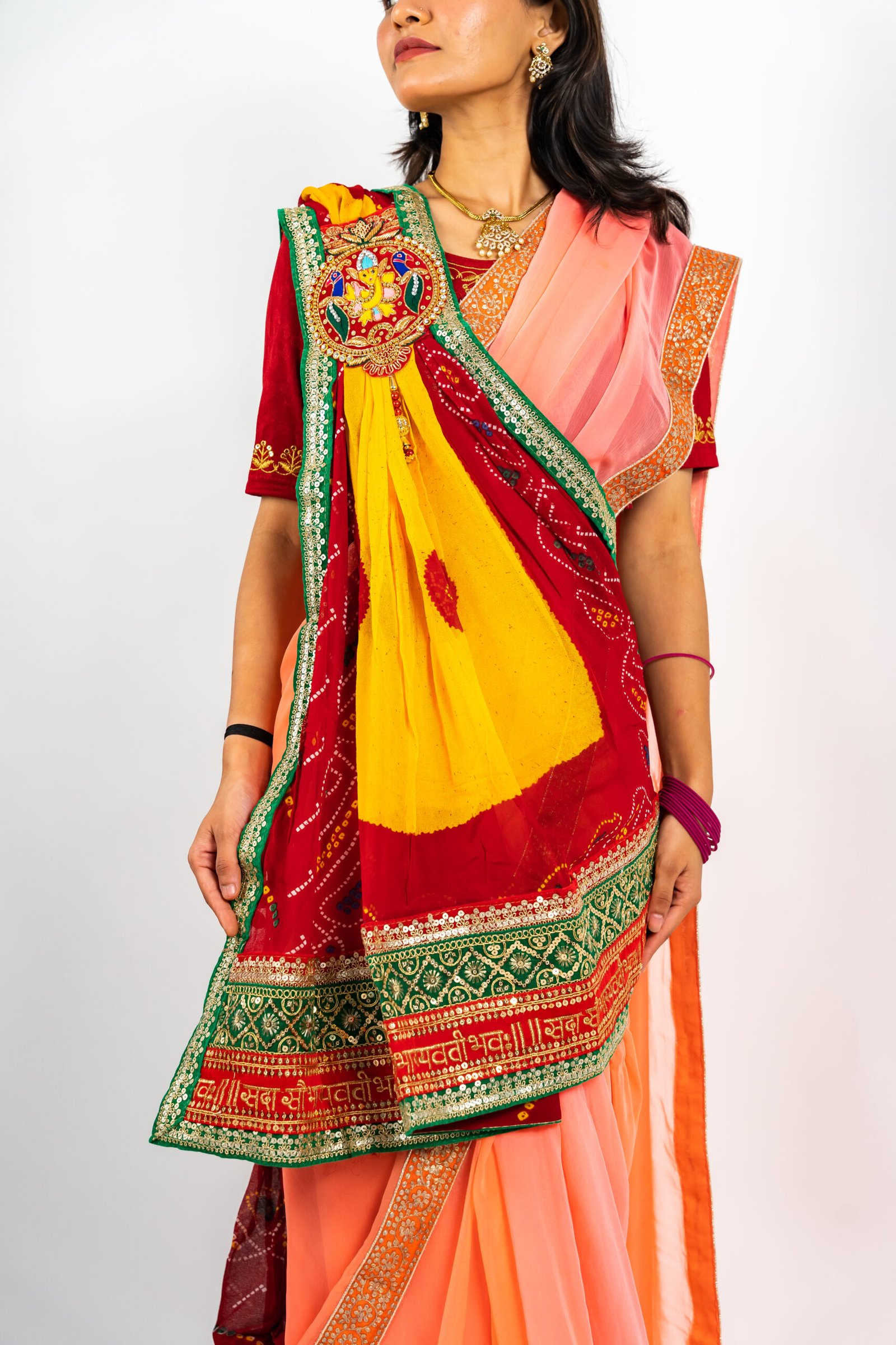 Traditional odhna adorned with Ganesh brooch for divine elegance.